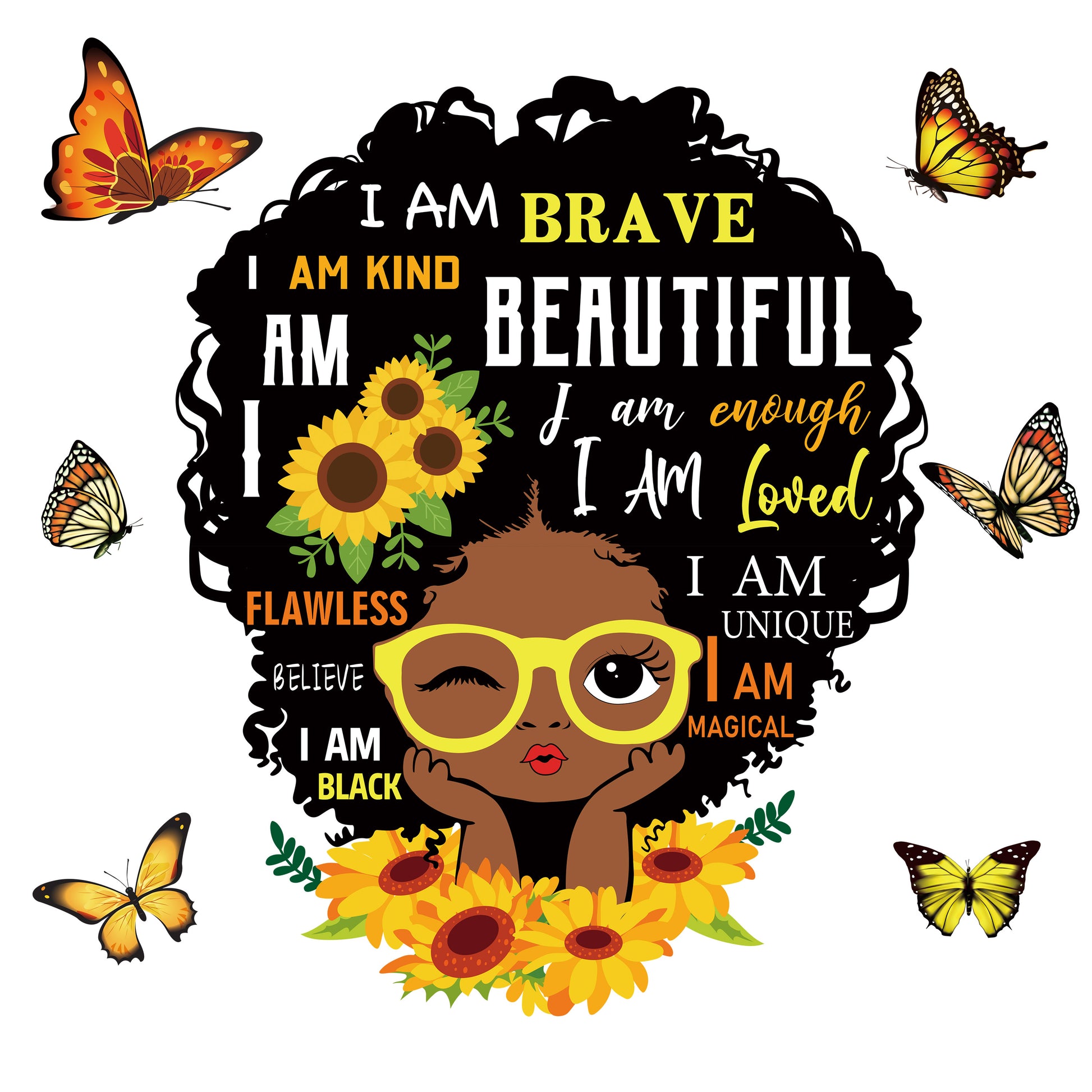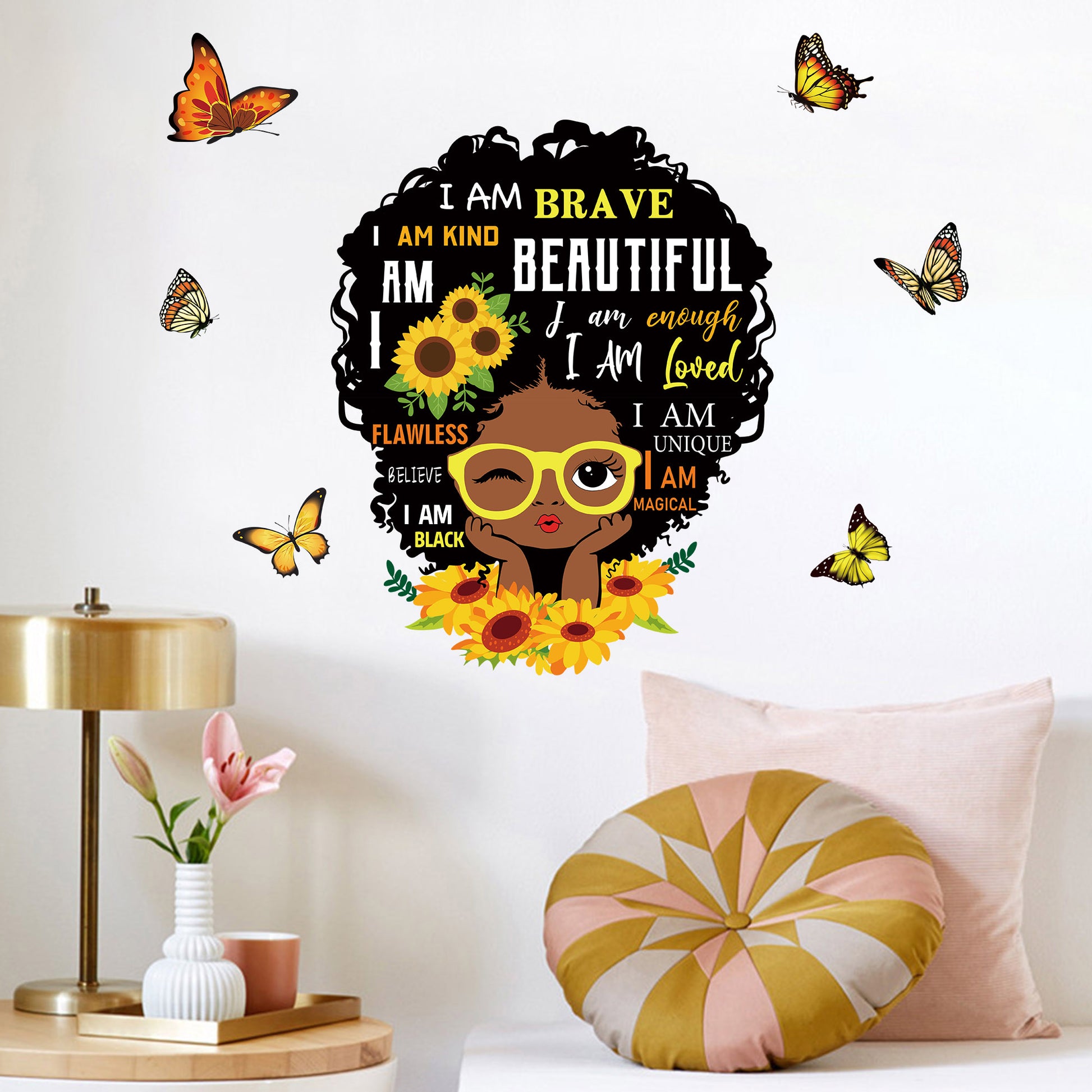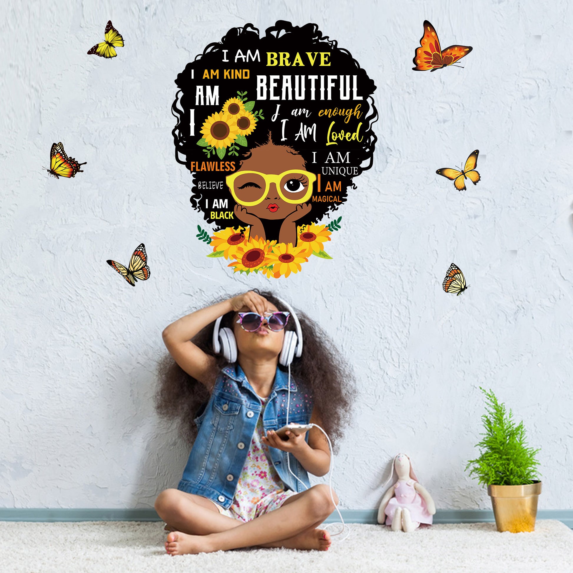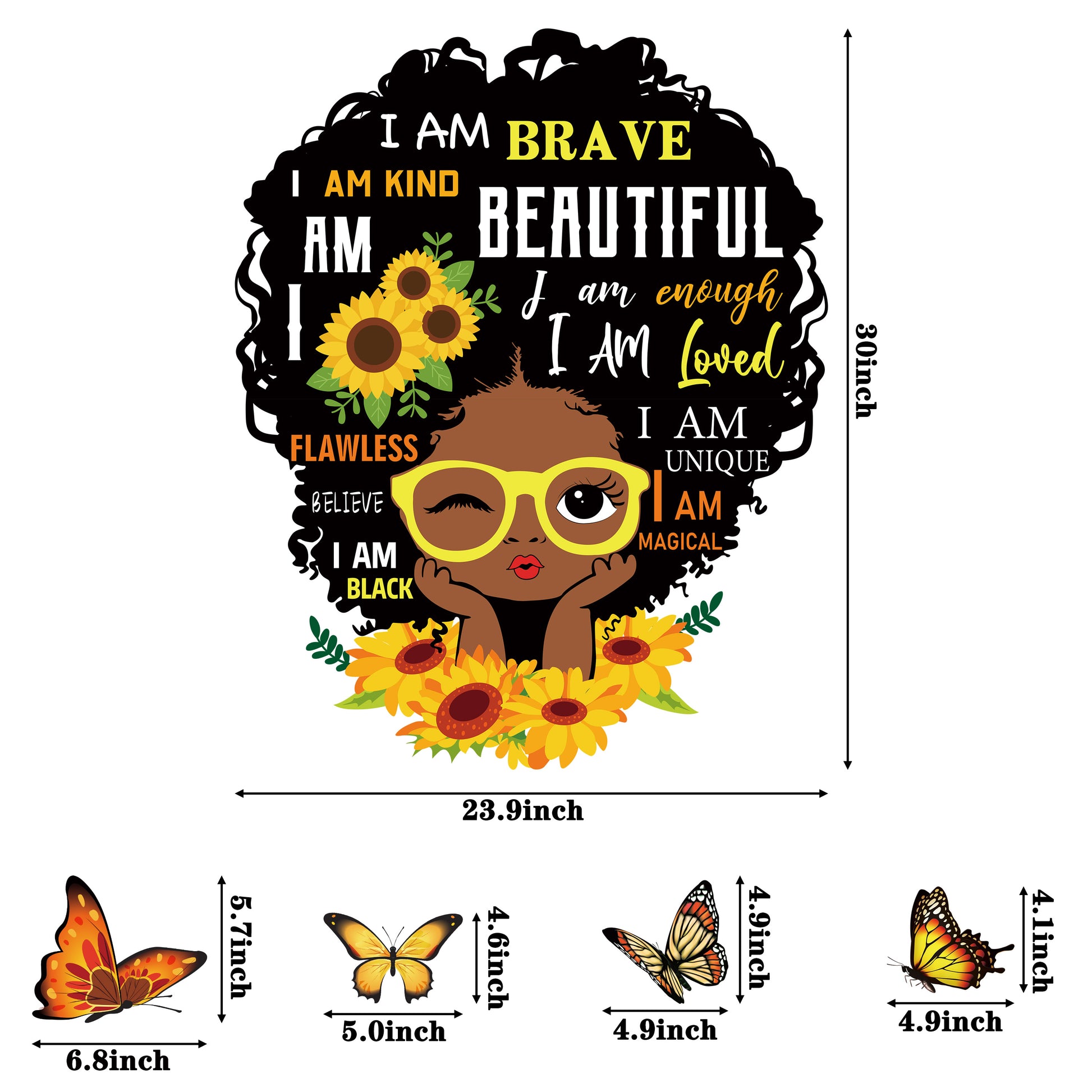 Size Detail: Our black girl sticker's whole size measures about 30*23.9 inches, and the butterfly stickers are in different sizes. (as picture 2 shown)