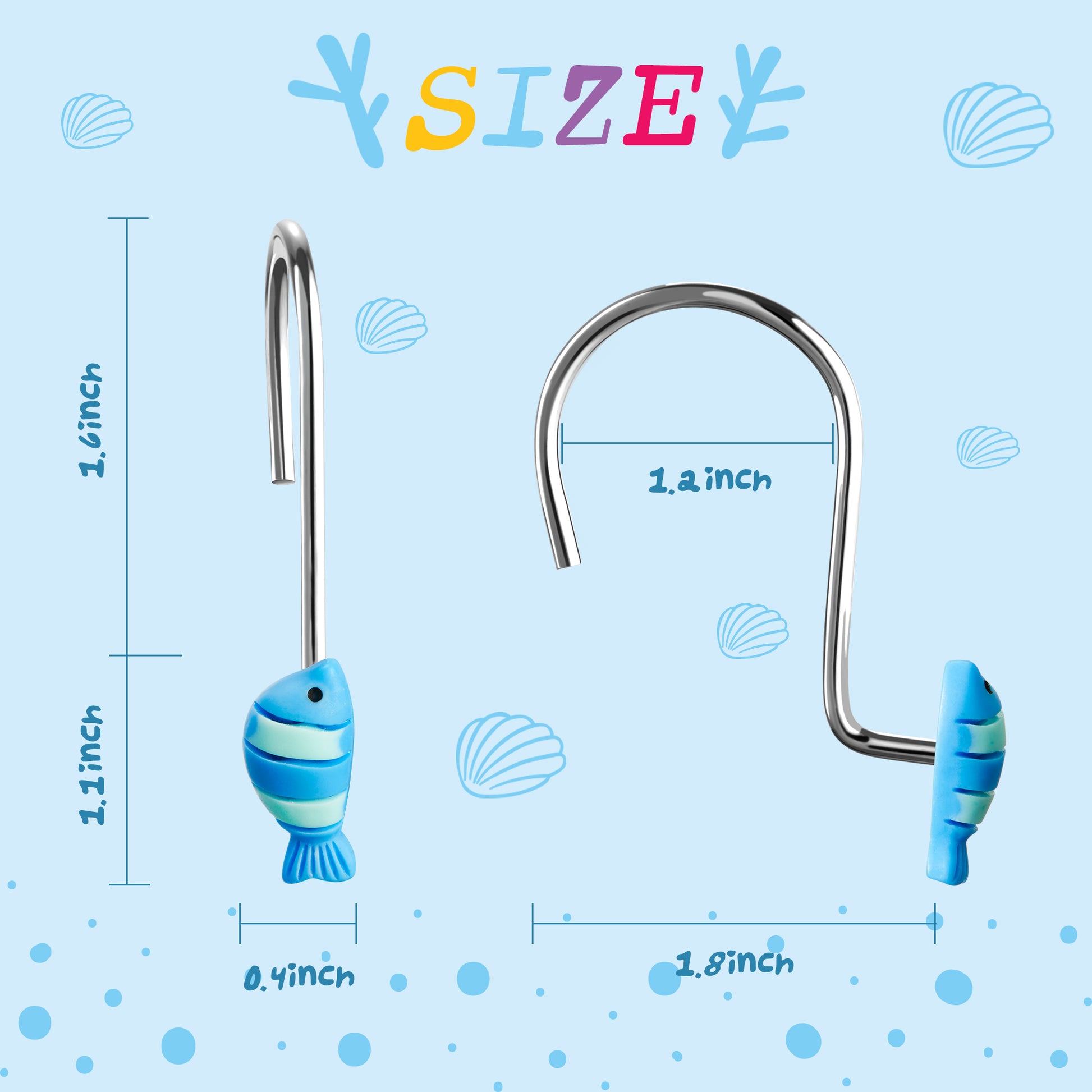 Size Detail: The total size is about 2.7*1.8 inches, the hook inner diameter is about 1.2 inches, the bluefish pattern diameter is 1.1*0.4 inches, fits standard-size shower rods.