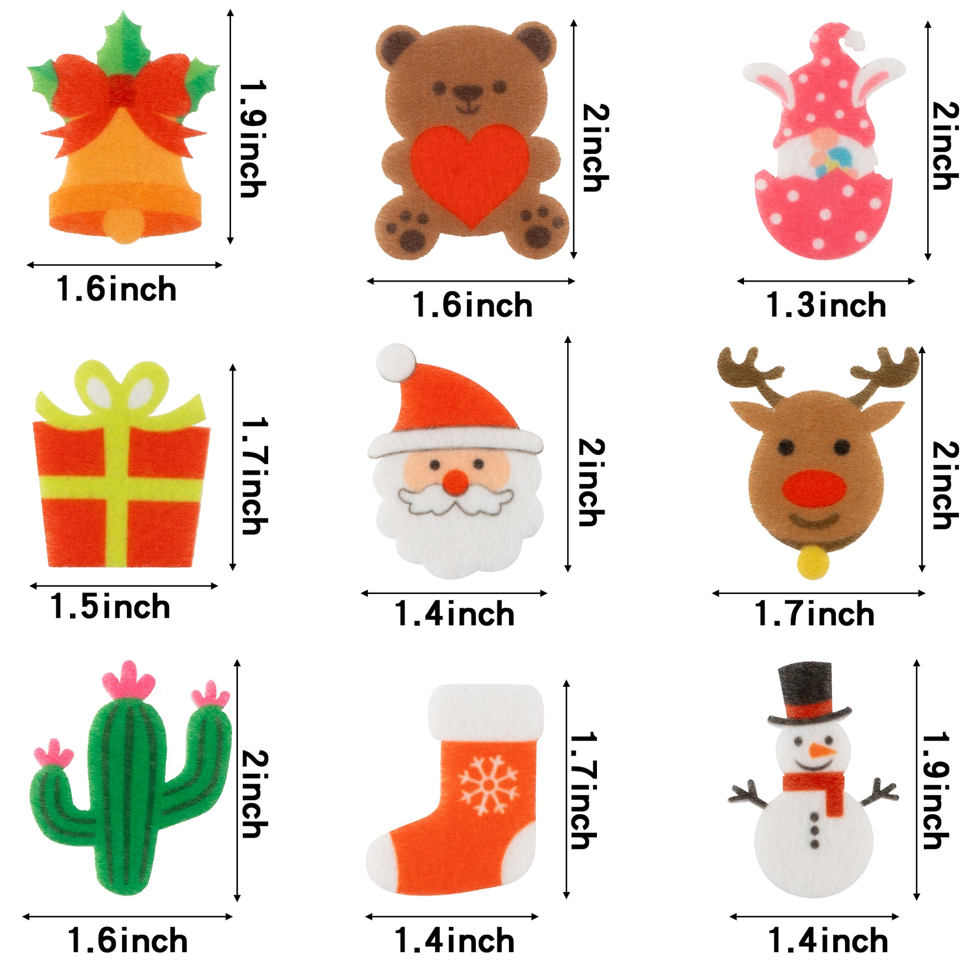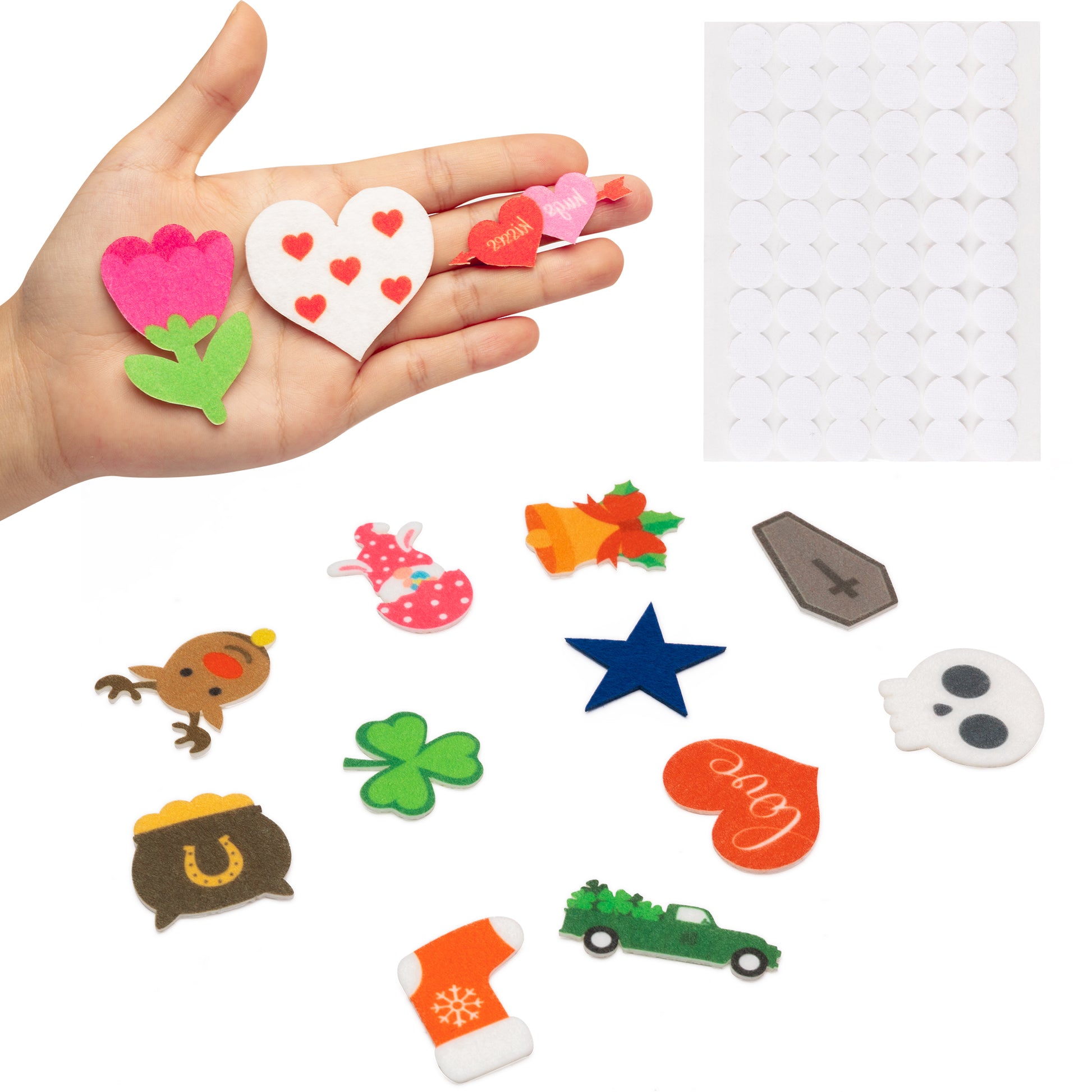 44pcs cute icons with different patterns, comes with 50pcs hook and loop self-adhesive dots tape.