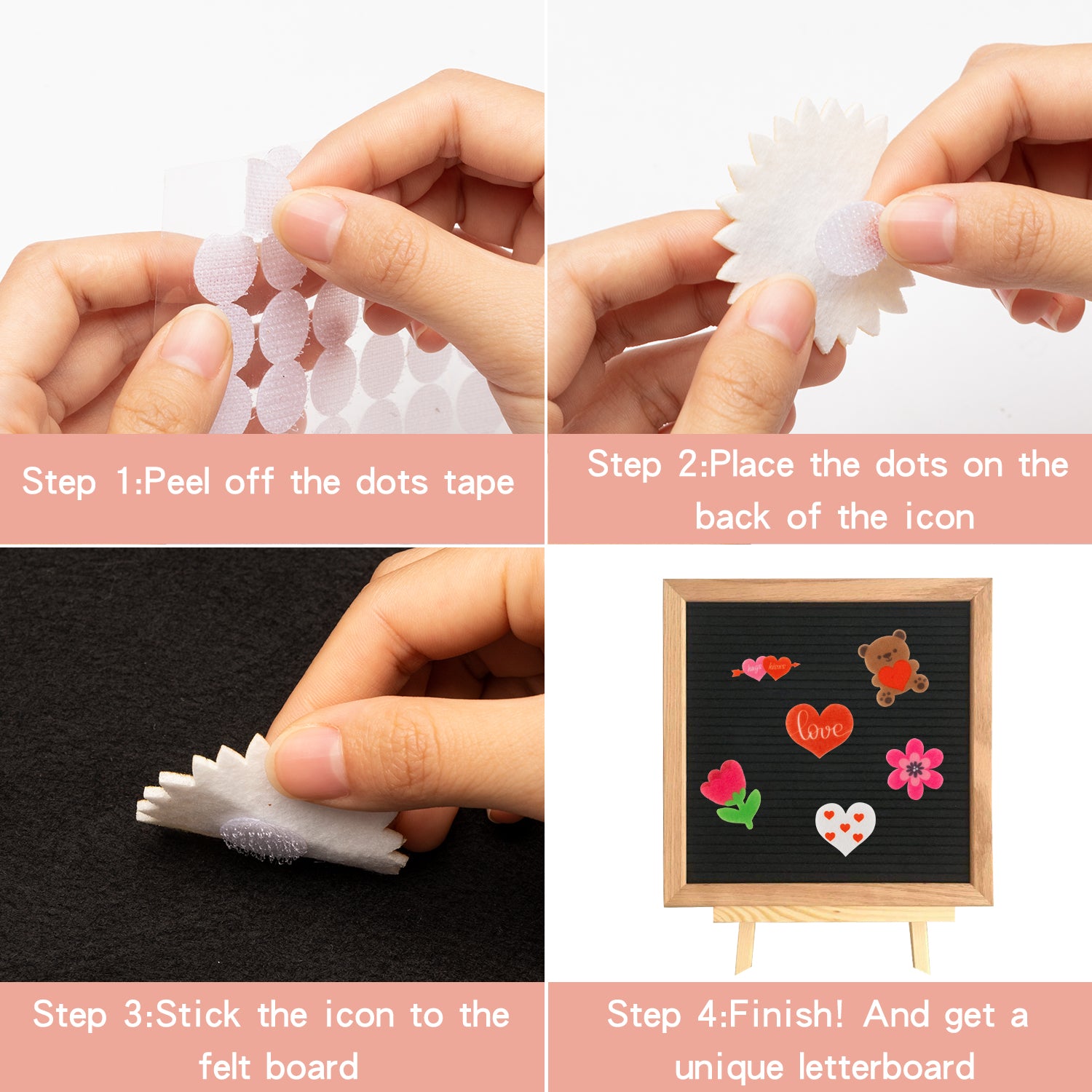 Material: Icons are made of felt, and the hook and loop self-adhesive dots tape is made of nylon. They can be easily attached to the letter board and can be reused many times which is not easy to break and deform.