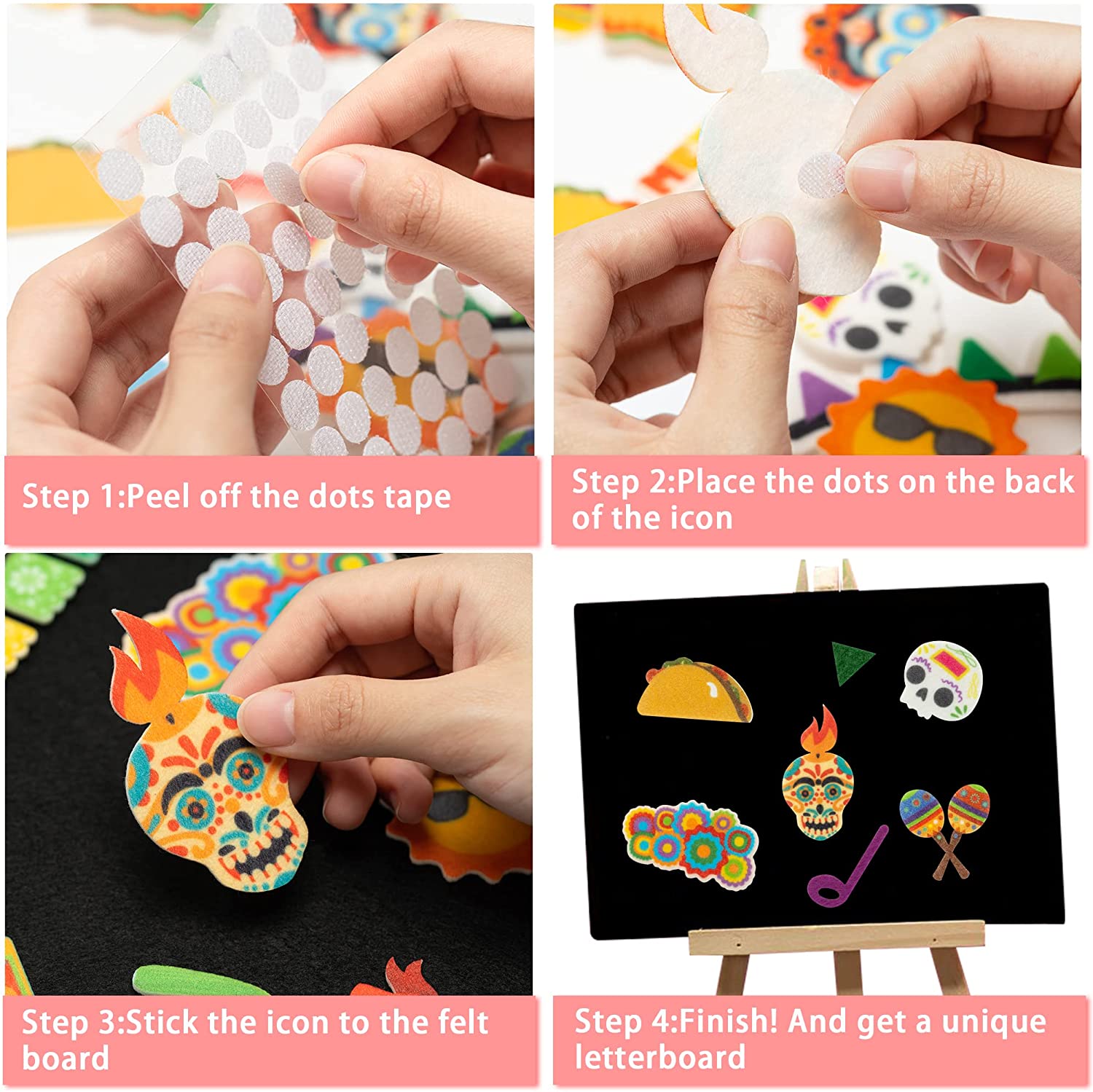 Material: Icons are made of felt, and the hook and loop self-adhesive dots tape is made of nylon. They can be easily attached to the letter board and can be reused many times which is not easy to break and deform.