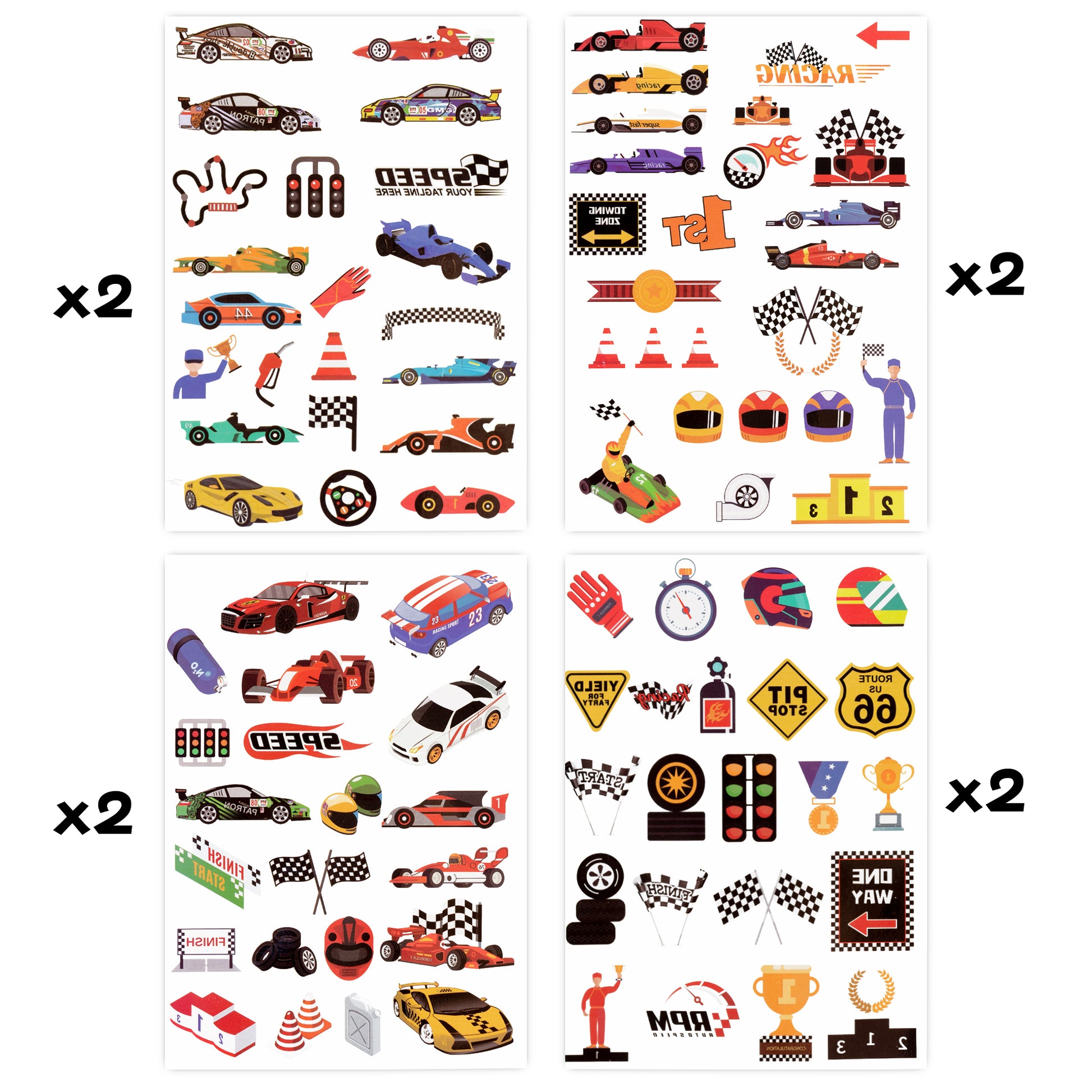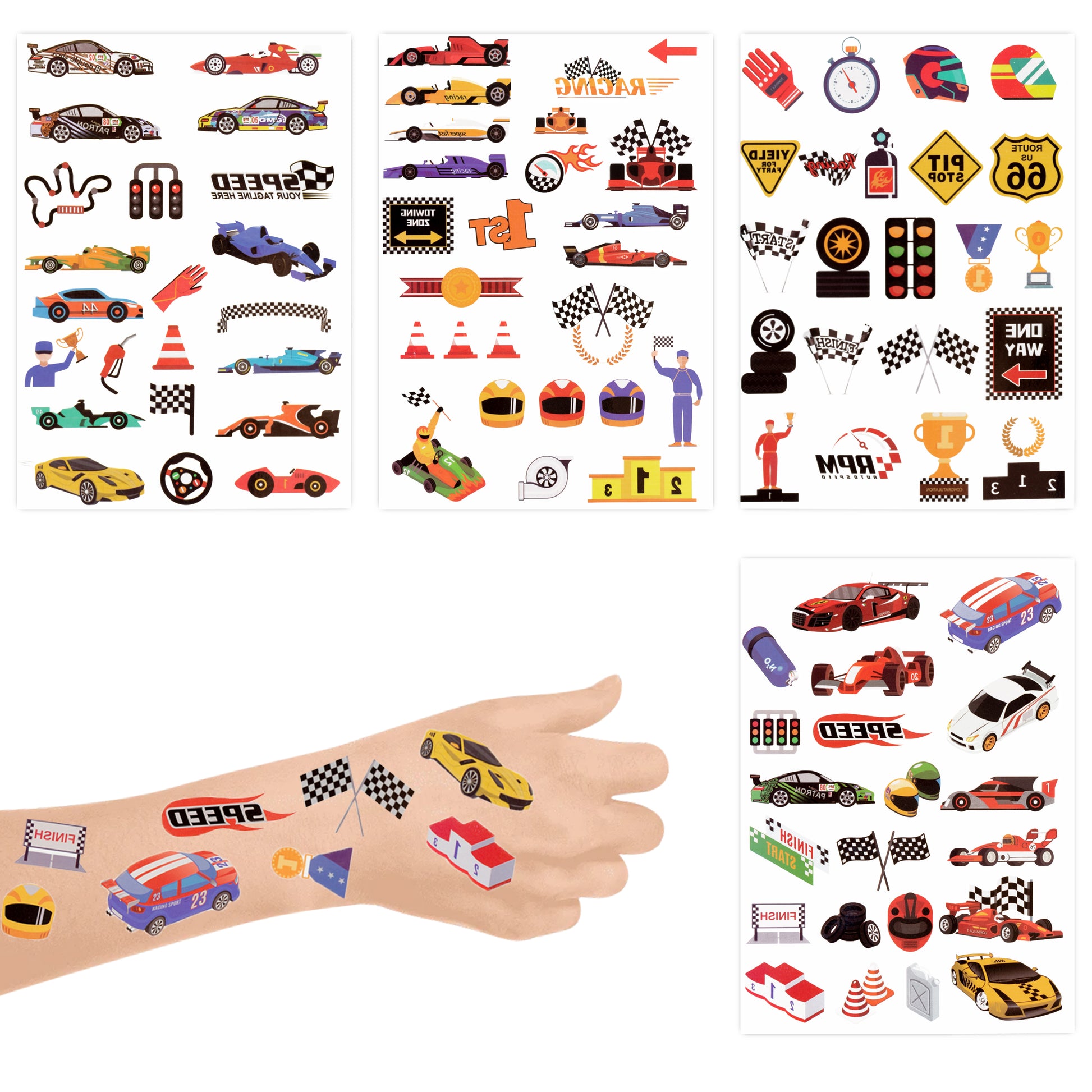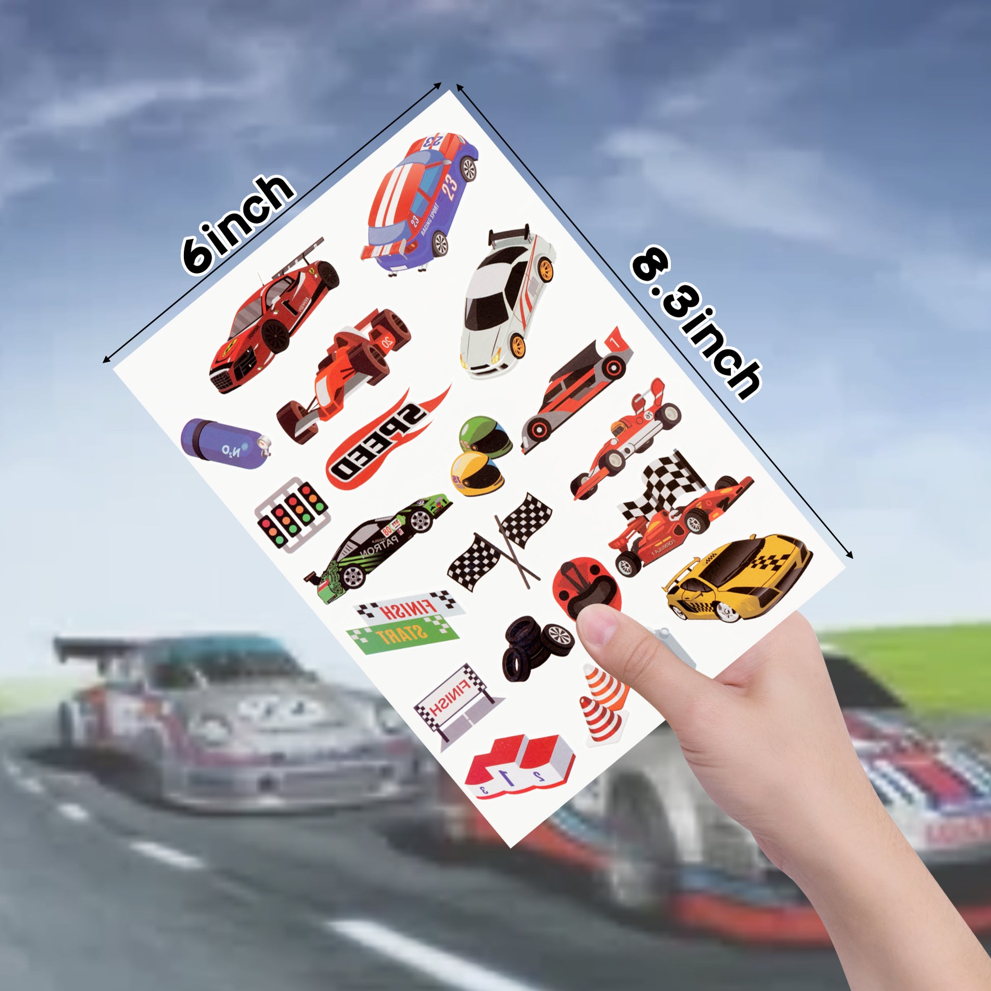 8 sheet of race car theme temporary tattoos, each sheet about 6*8.3 inches.